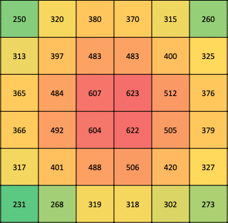 Die Messungen erfolgten bei geöffnetem Zelt mit einem Quantum Par Meter. Dabei wurden jeweils 36 Messpunkte verfolgt. Das erhaltene PPFD Raster kann dabei helfen ein Gefühl für den richtigen Abstand zu bekommen.