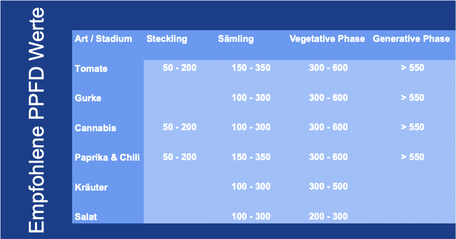 Von Sanlight habe ich die folgenden empfohlenen Richtwerte für die Lichtintensität, gemessen in PPFD, für verschiedene Pflanzenarten und Wachstumsstadien erhalten.