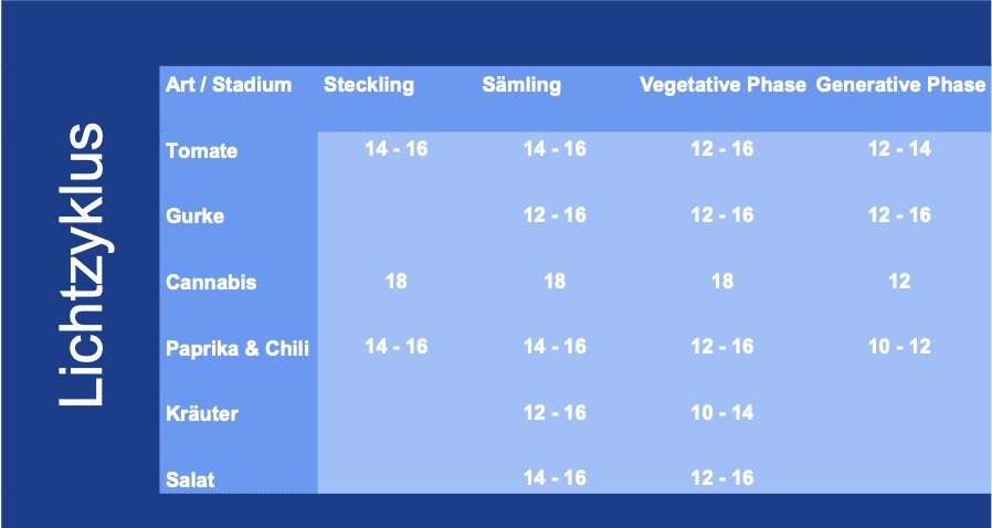Generell sind diese untergliedert in Sämling oder Stecklingsbeleuchtung. Weiterhin in die Beleuchtung während der Wachstumsphase ( Vegetativer Wuchs ) und in die Beleuchtung während der Blütephase ( Generativer Wuchs ).