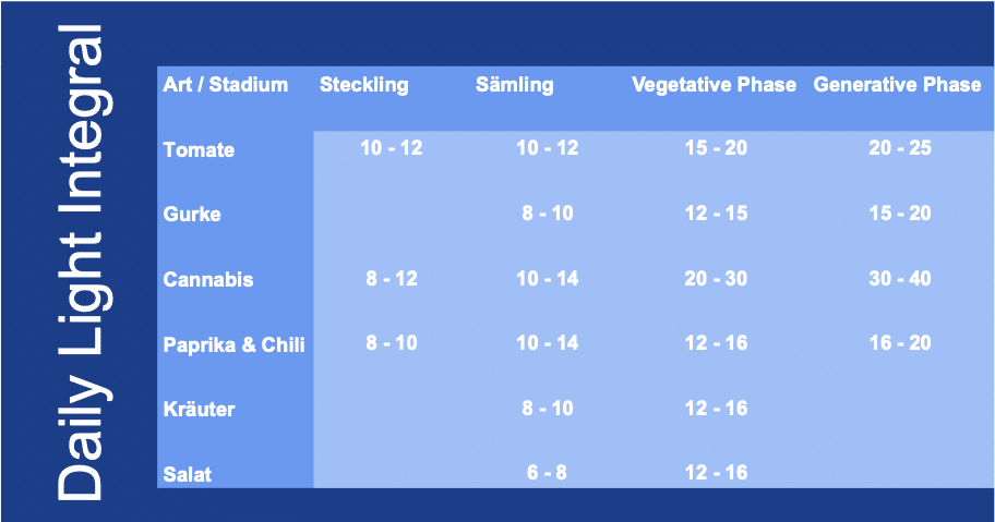 Auf den vorhergehenden beiden Tabellen basierend lassen sich die folgenden Werte für die Tägliche Lichtmenge (DLI) ableiten.